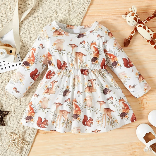 Adorable Animal Print Long Sleeve Pleated Dress for Baby Girls