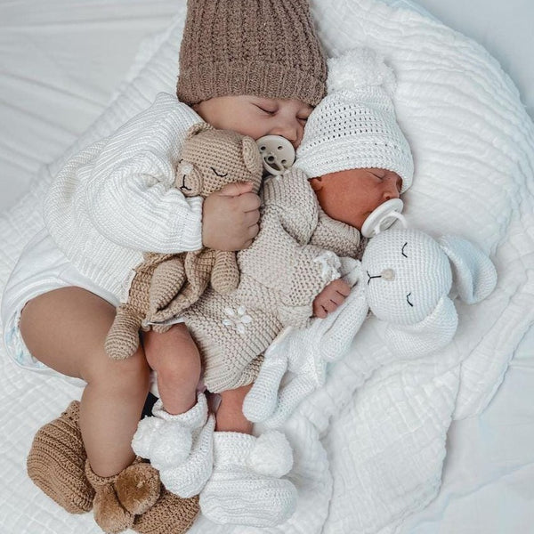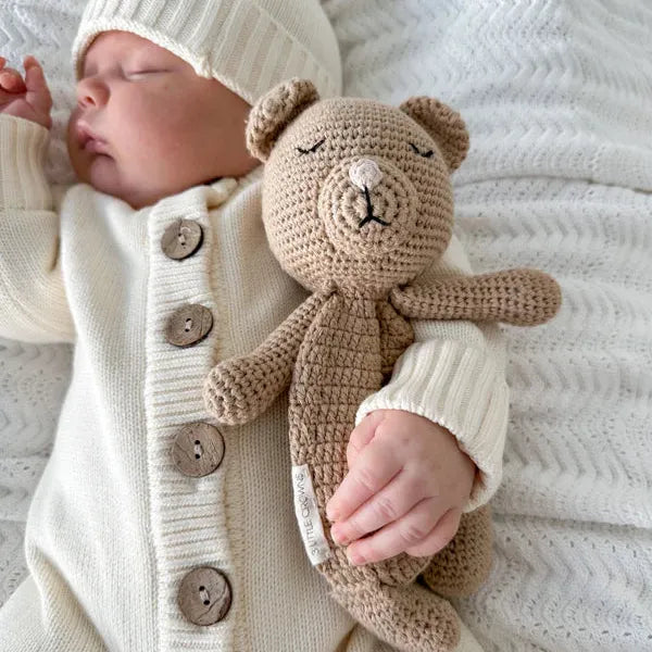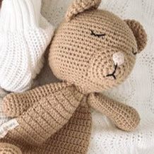 Experience ultimate comfort with our Handmade Cuddle Me Crochet Bear - the most adorable Comforter you'll ever lay eyes on! This specially designed and sized bear is perfect for newborns and will be a loyal companion for years to come. It's not just a toy, it's a symbol of comfort and friendship. Capture the precious moment with our Cuddle Me in a birth announcement photo and make it your go-to gift for any new arrival!