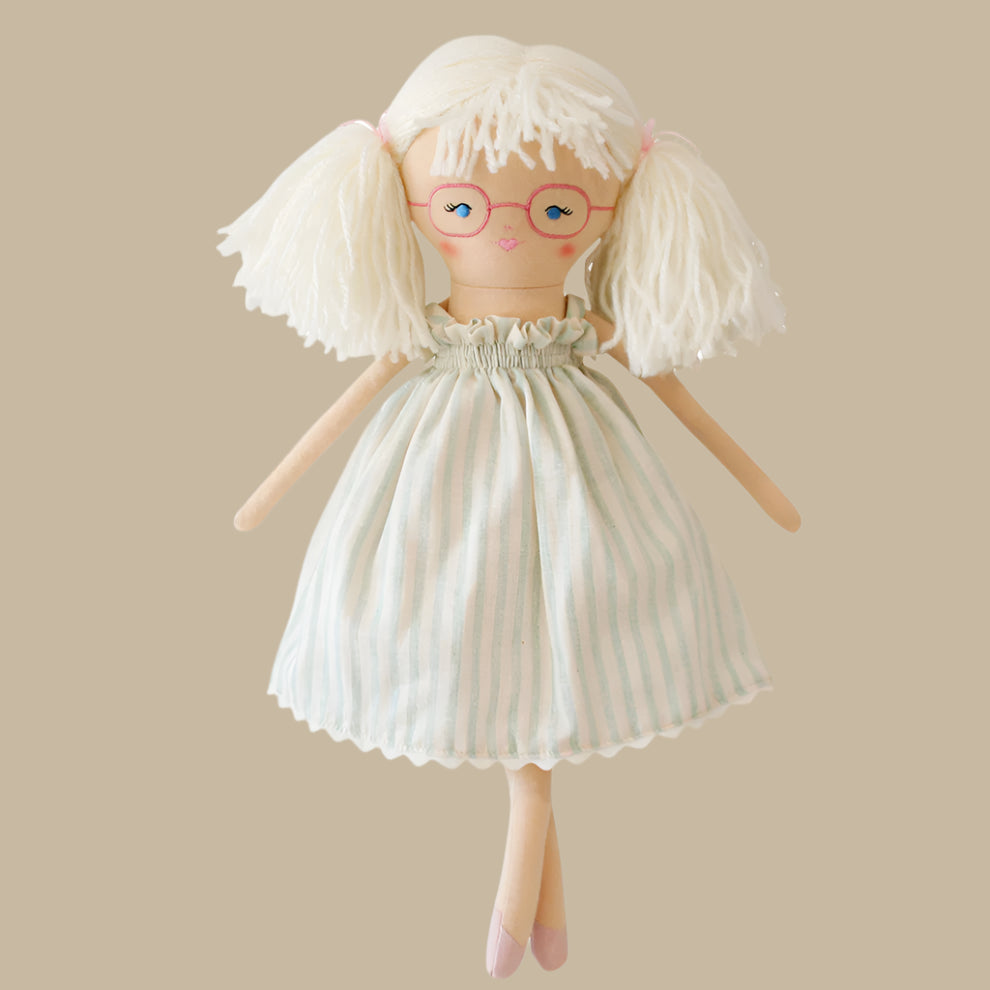 Get ready for a fun shopping trip or tea party with Jessi, the perfect companion for any little girl. With her beautiful sage stripe dress, Jessi is suitable for 3 years and up. Plus, you can easily remove her dress and dress her in any of our large doll dresses.