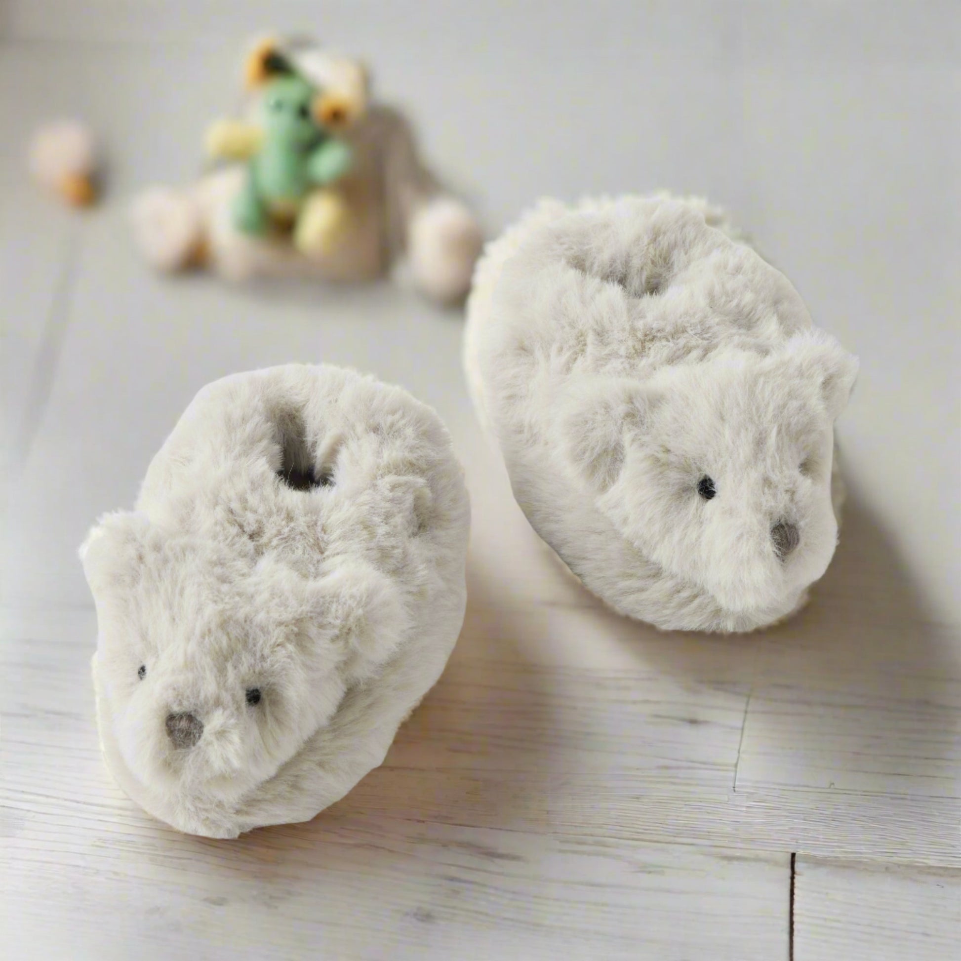 Features: • Soft, gentle fit for delicate feet • Secure stay-on design • Adorable teddy bear detailing • Perfect for daily wear • Makes a heartwarming baby shower gift