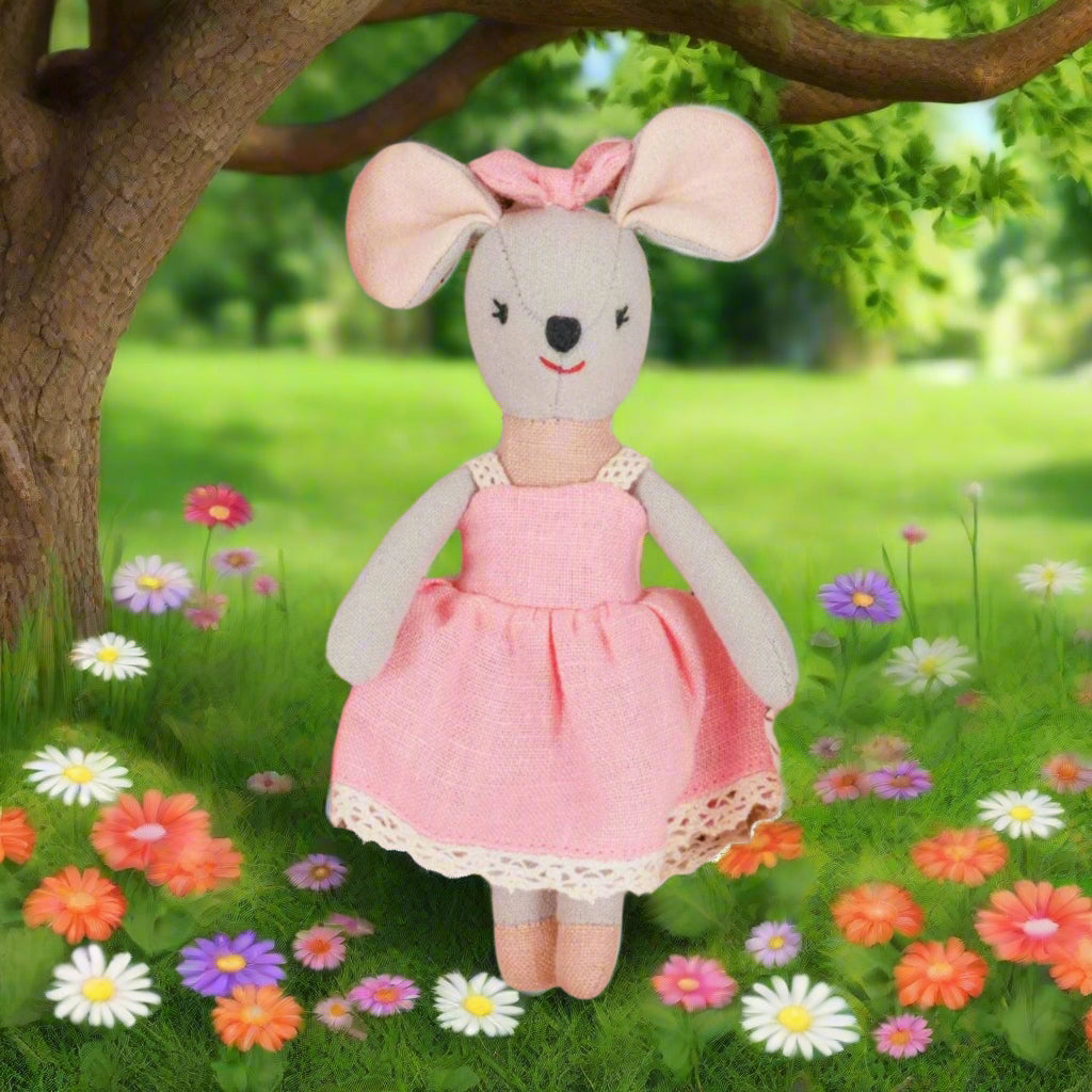 Mouse Lili is the cutest thing ever. She is wearing a simple yet charming pink dress, the kind that feels like it belongs in a fairytale—a soft, cotton fabric with just the right amount of flow, perfect for twirling. And yes, a bow on her head just adds that extra bit of sweetness. Little Mouse Lili is ready to greet you with a smile.